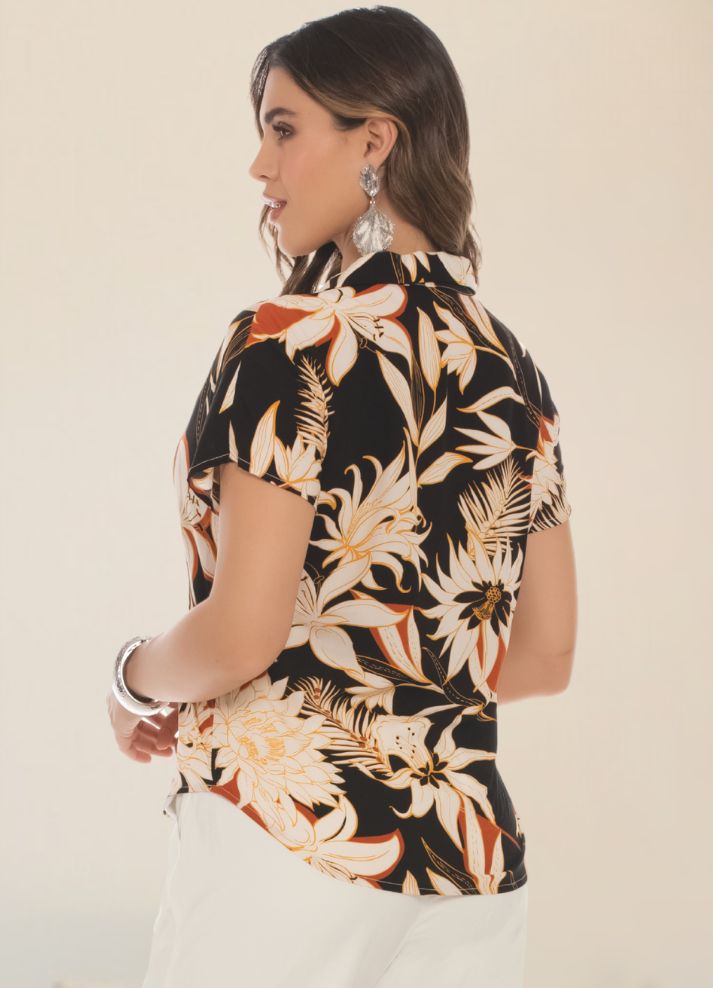 Camisa de manga corta está confeccionada en rayón viscosa, ofreciendo una textura suave y transpirable. Su fondo negro con diseño floral aporta un estilo elegante y versátil, ideal para diversas ocasiones.