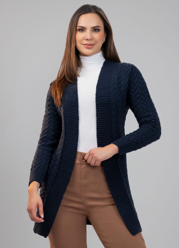 Cárdigan largo de corte abierto, tejido en hilo trenzado que aporta textura y sofisticación, ideal para un look elegante y confortable.