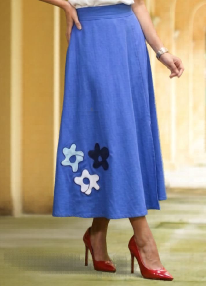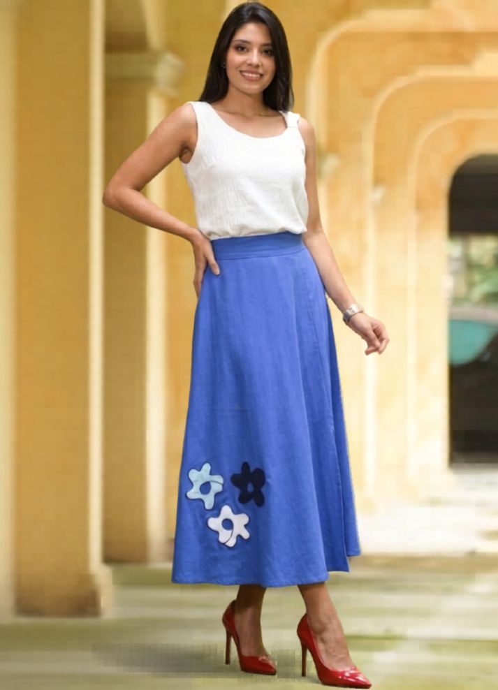 Falda con bordado artesanal. Elaborada en Lino en tono azul rey, fresca con textura natural que transmite elegancia, aportando movimiento. Hecho en Colombia.