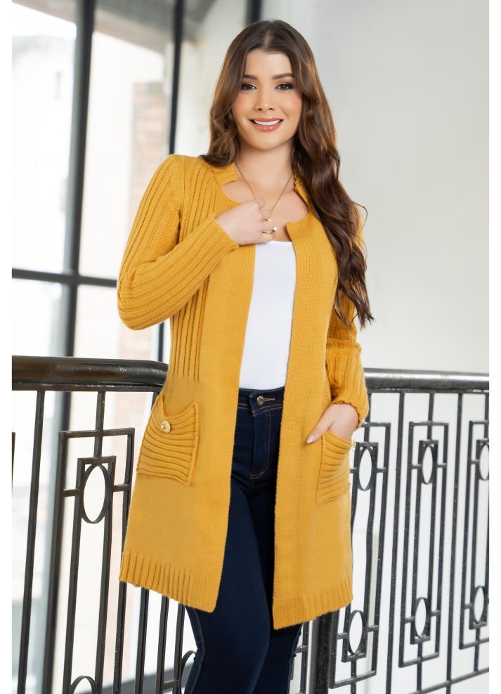 Cardigan abierto largo tejido en hilo con bolsillos funcionales. Ideal para ocasiones casuales y transiciones de clima frío. Diseño acanalado en tono mostaza que combina elegancia con comodidad.