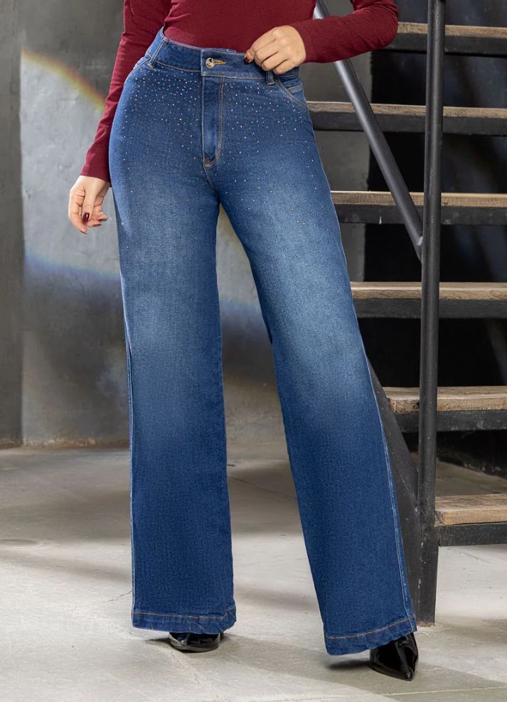 Jean bota palazzo, con bolsillos, pretina alta con 1 botón, elaborado en denim estampado con decorado de piedras.