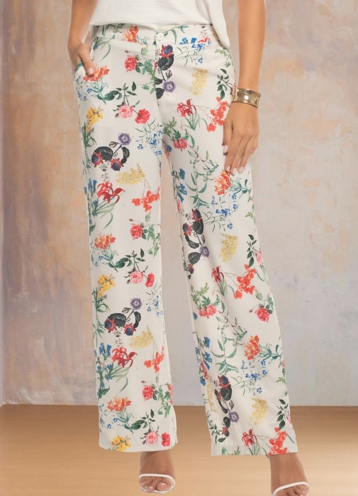 High-waisted palazzo pants with a button and zipper closure, made of polyester with a vibrant floral print. Their fluid and colorful design adds a fun and chic touch to your look, perfect for standing out with personality and joy. Dare to wear them and dance with every step!