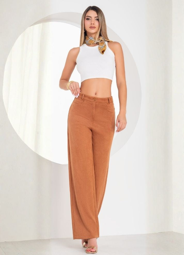 Pantalón palazzo de tiro alto con pretina alta reforzada, cierre de un botón y bolsillos funcionales, confeccionado en corderoy plano. El tono ladrillo aporta calidez y versatilidad, adaptándose a prendas neutras o tonos tierra. Corte que favorece la silueta.