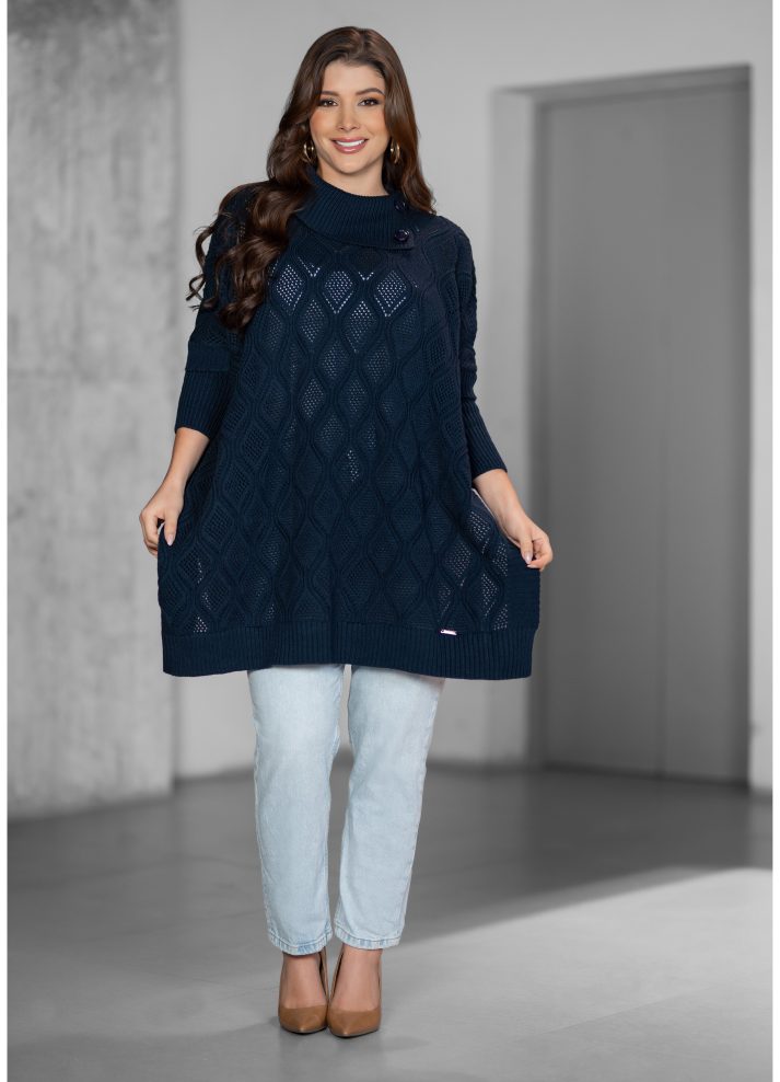 Ruana tejida en hilo color azul marino con cuello alto y mangas largas. Pieza versátil que combina calidez y elegancia. Diseño atemporal que se adapta a looks casuales. Combínala con collares o accesorios para elevar tu estilo y crear composiciones únicas que reflejen tu personalidad.