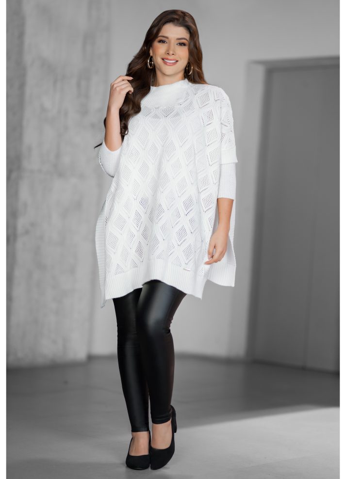 Ruana tejida en hilo suave color marfil con cuello alto y mangas largas. Su textura envolvente y tono claro crean una presencia elegante y sofisticada. La caída natural del tejido favorece cualquier tipo de cuerpo, mientras que el cuello alto añade un toque de refinamiento.