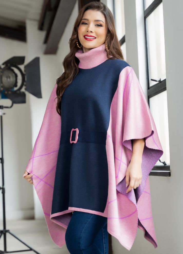 Ruana tipo capa cuello tortuga con herraje decorativo simulando cinturón tejida en hilo