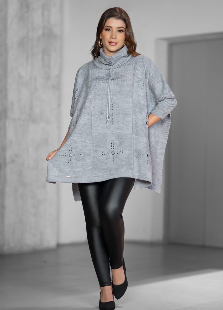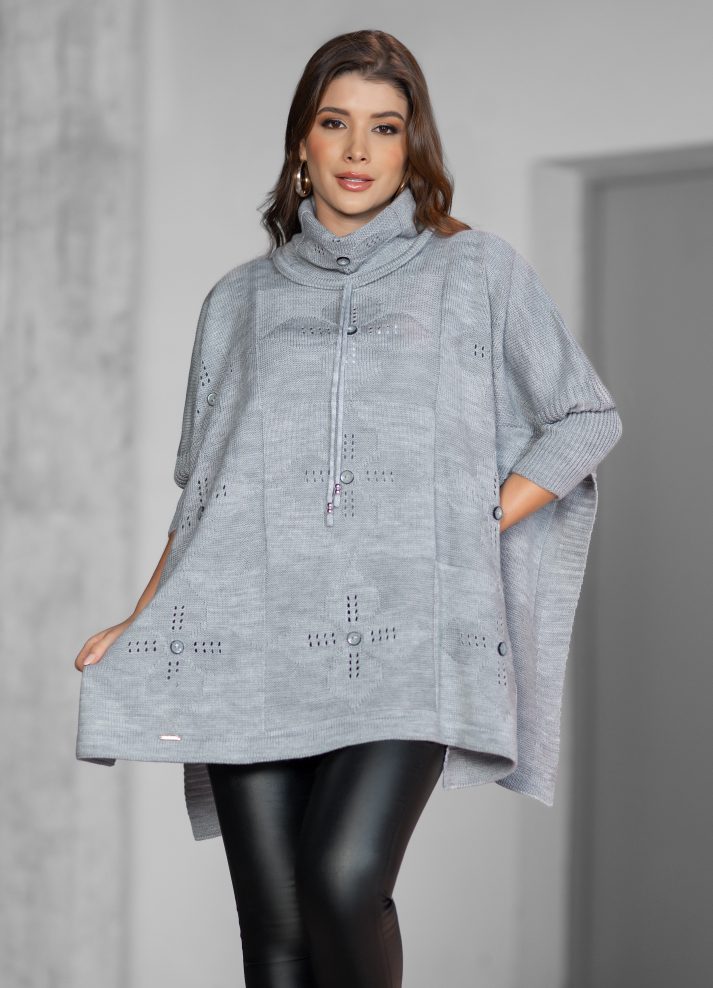 Ruana tejida en hilo suave color gris con cuello tortuga y mangas largas. Pieza versátil que combina calidez y elegancia, perfecta para capas sobre looks casuales.