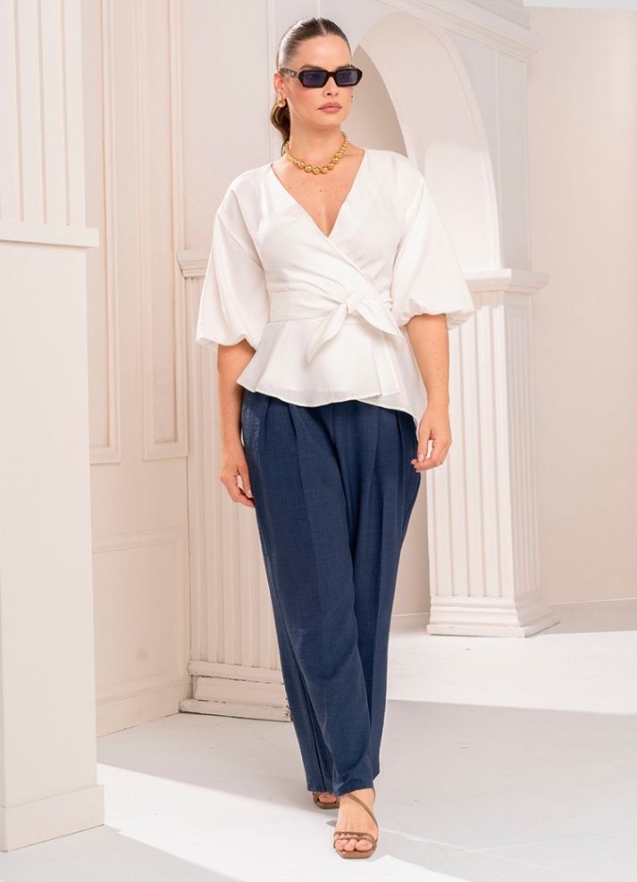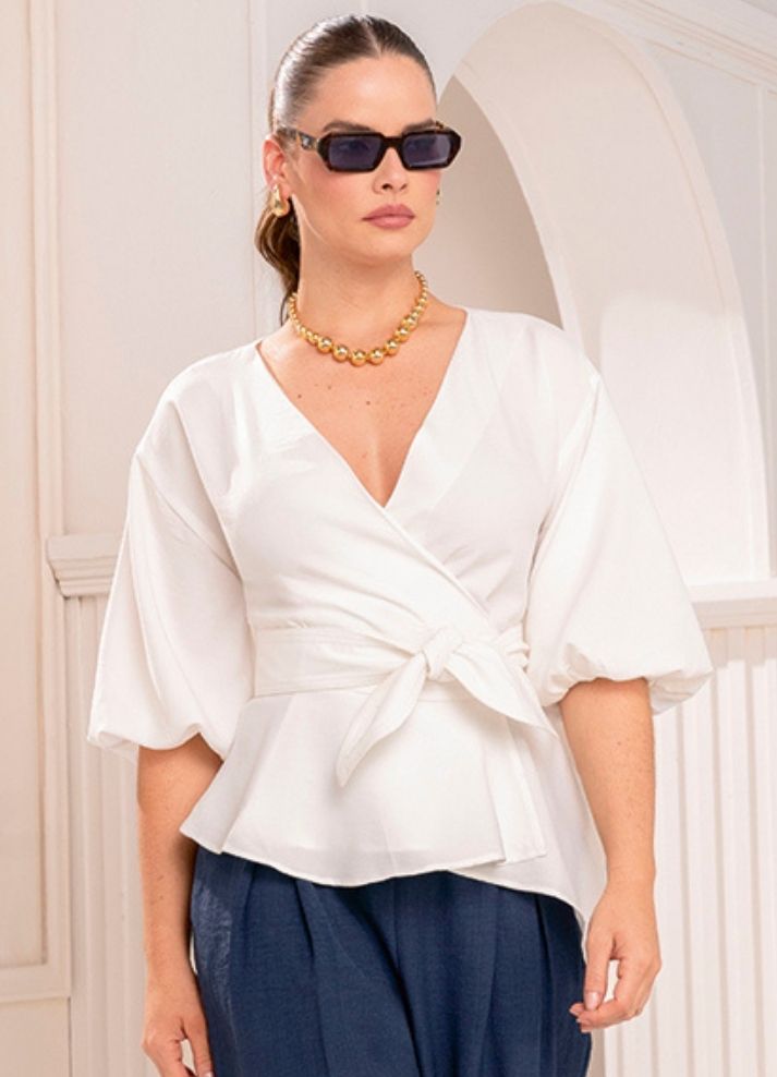Blusa manga globo 3/4 con escote cruzado, volante y cinturón, elaborada en crepé especial. Su diseño femenino y elegante es ideal para eventos especiales.