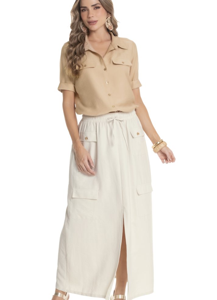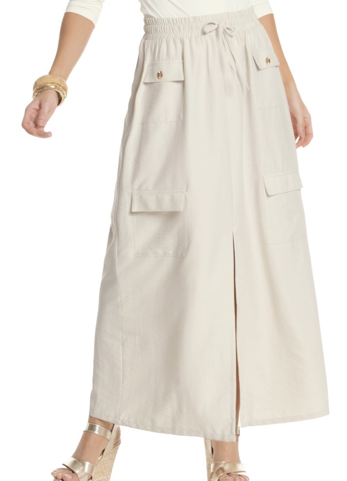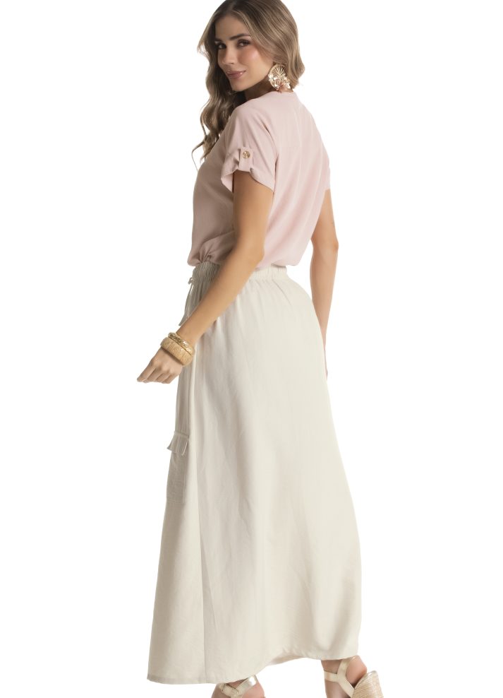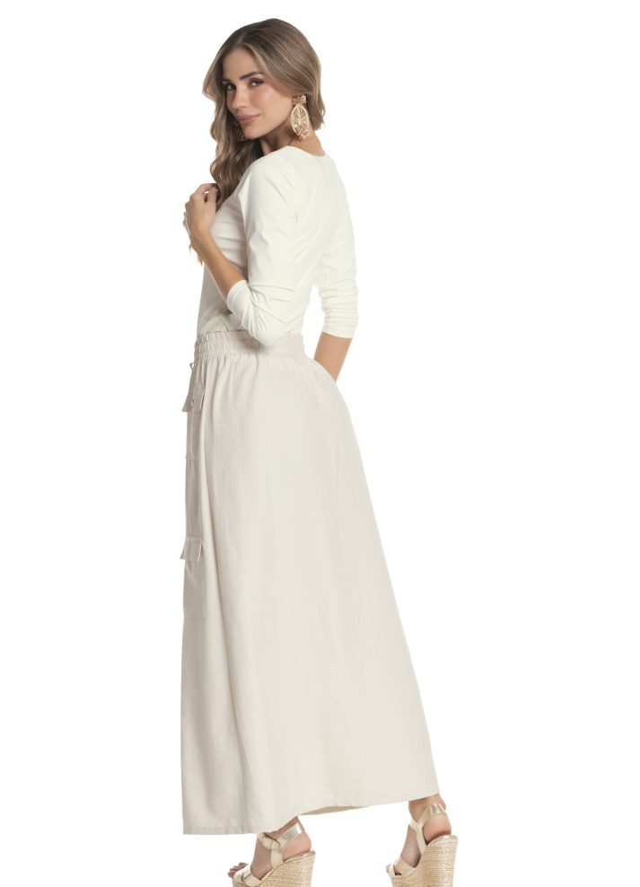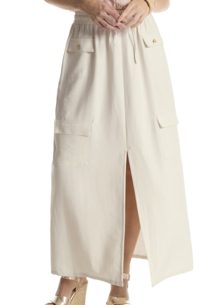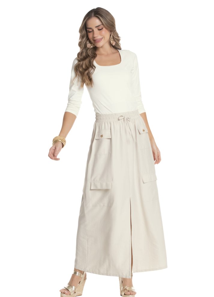 Falda larga con bolsillos tipo cargo, cintura resortada, abertura frontal discreta dando un efecto de corte en A, definiendo tu figura delicadamente. Elaborada en poliéster
