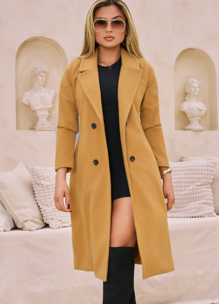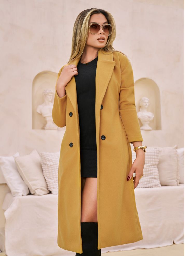 Gabán largo en paño en tono mostaza, con cuello de solapa, botones y bolsillos. Totalmente forrado, ideal para ocasiones tanto casuales como formales, adaptándose fácilmente a tu guardarropa.