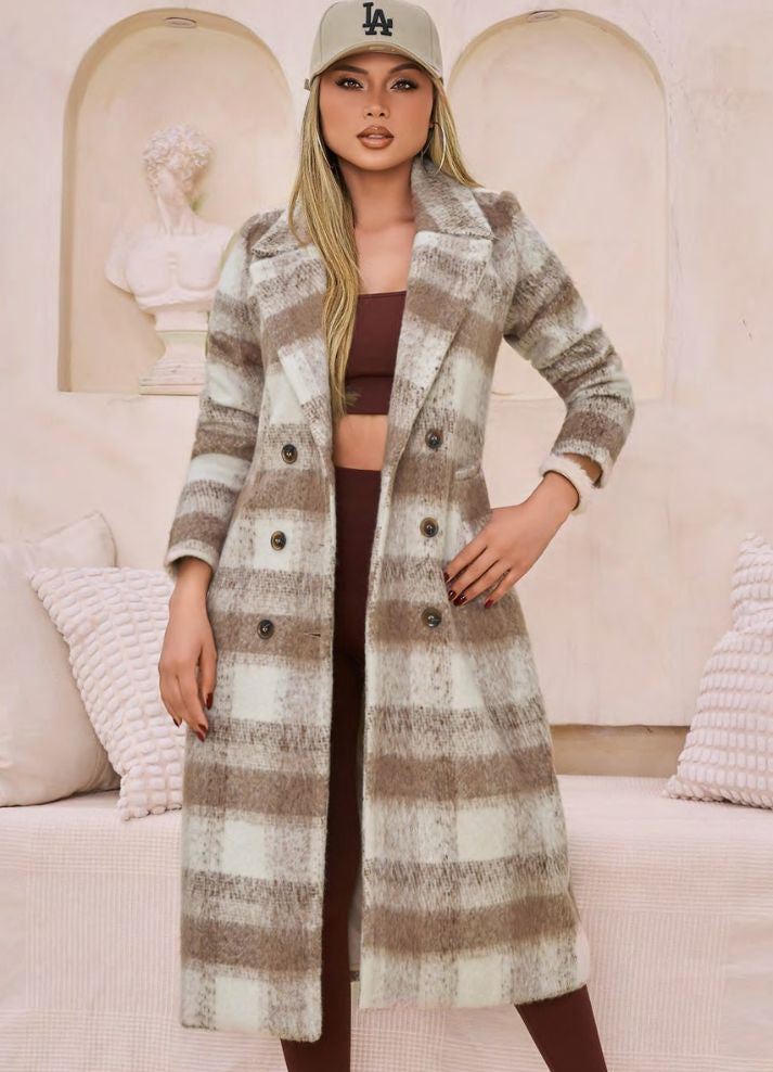 Gabán largo de paño cachemir a cuadros ofrece un diseño sobrio, elegante y muy versátil con un cuello solapa clásico que realza su carácter refinado. Sus bolsillos prácticos, con botones permiten una funcionalidad sin perder la sofisticación.