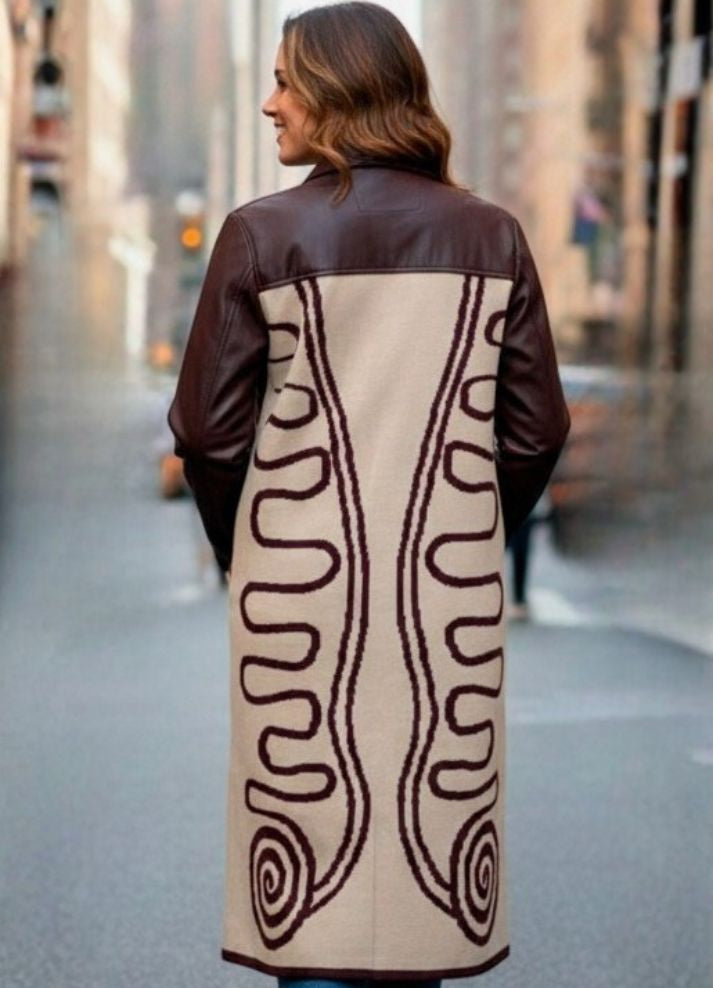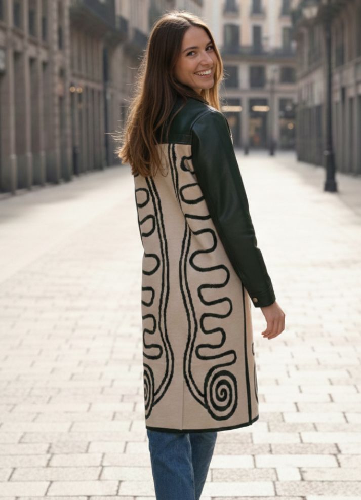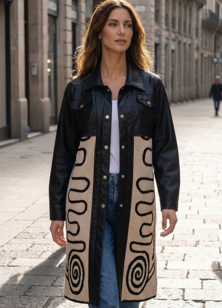 Gabán largo con una delicada mezcla de cuerotex y tejido en hilo con motivos étnicos Disponible en negro y borgoña —colores que trascienden las modas— ofrecen versatilidad discreta. Una prenda que recuerda que la verdadera distinción no se anuncia, sino que se experimenta.