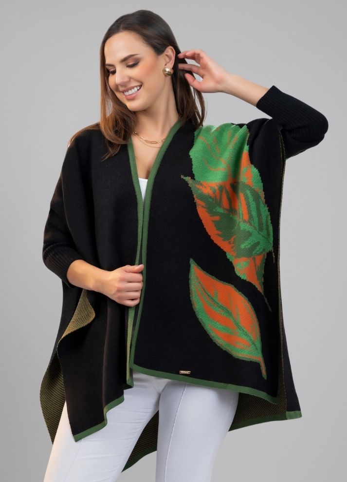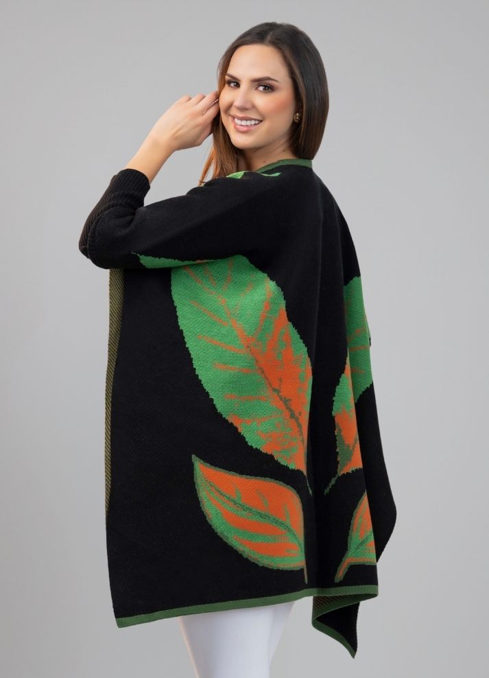 Ruana tipo capa con mangas, elaborada en hilo y decorada con un diseño de hojas