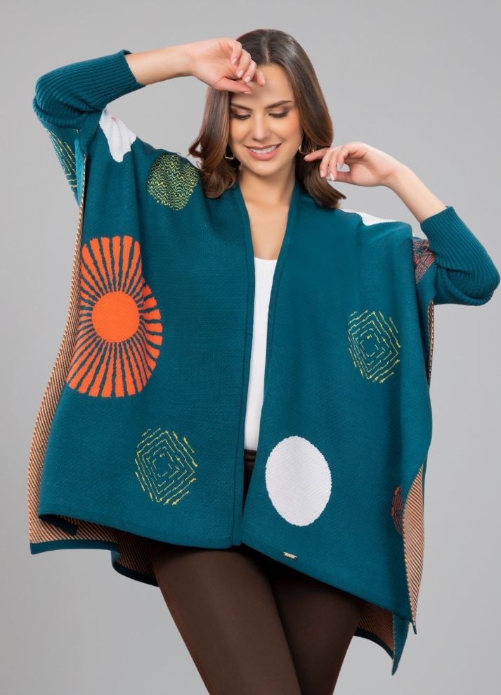 Ruana tipo capa con mangas, elaborada en hilo y decorada con un diseño de pepas