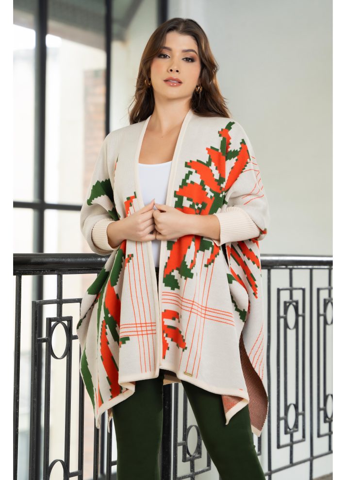 Ruana con mangas patrones de hojas tejido en hilo. textil de calidad ideal para días fríos con un estilo relajado en tono beige.