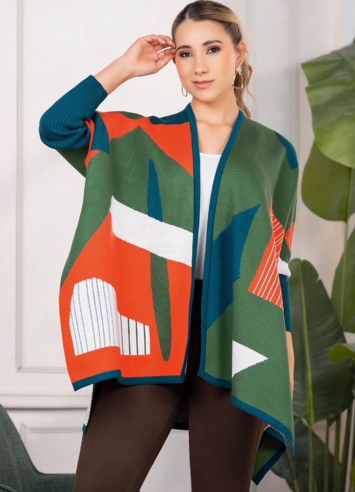 Ruana tipo capa con mangas, tejida en hilo multicolor