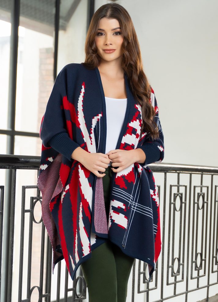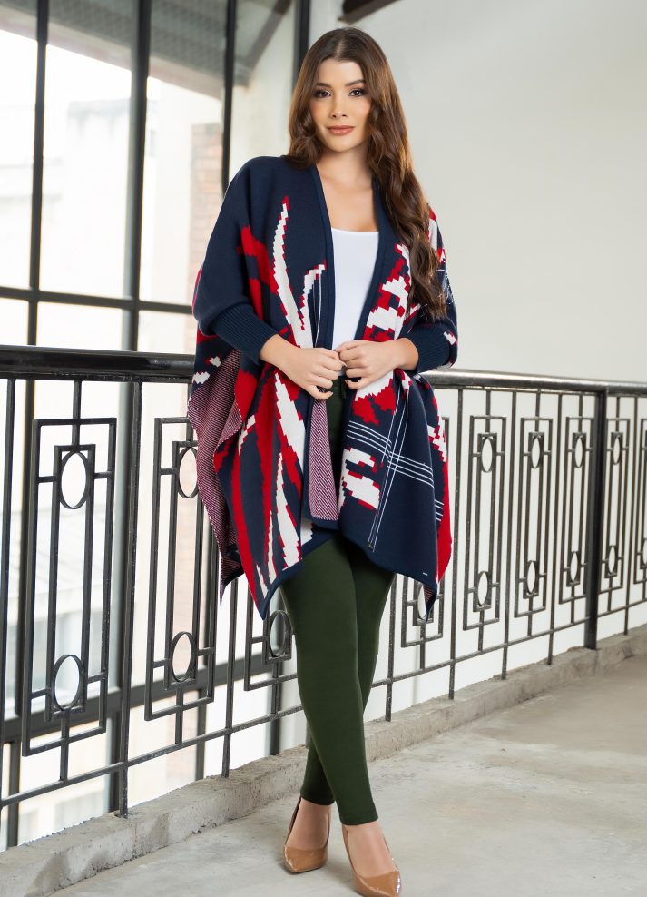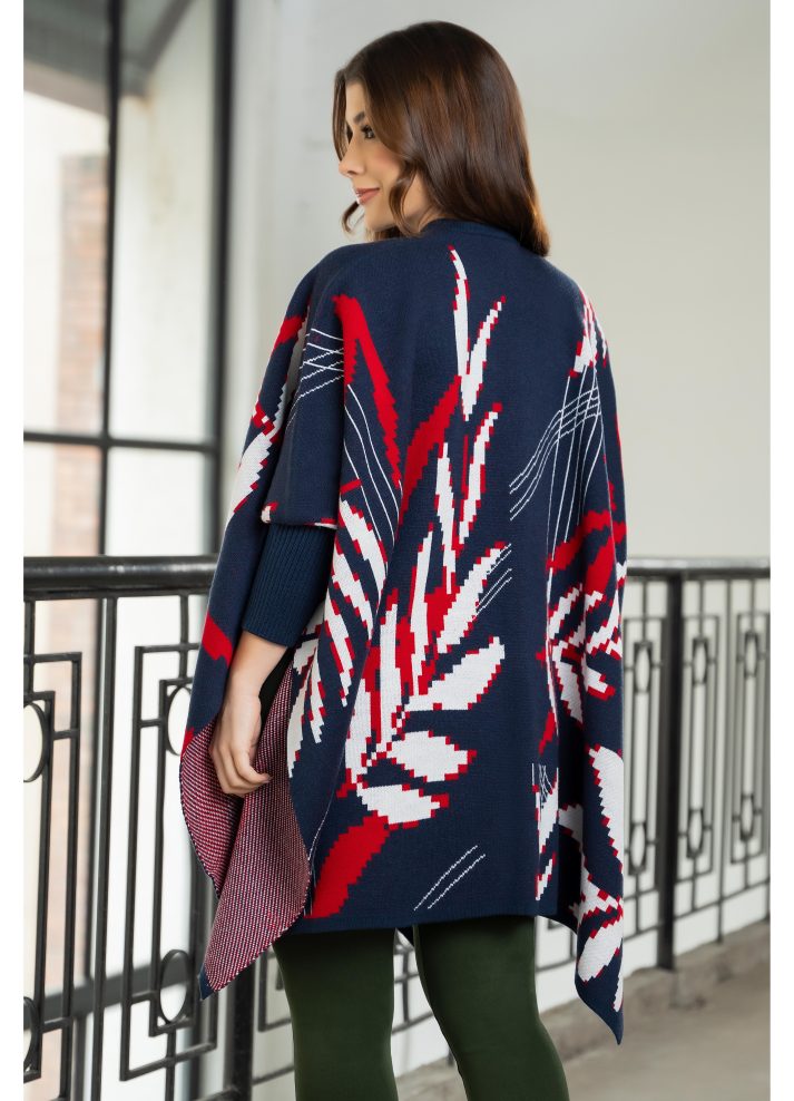 Ruana con mangas patrones de hojas. tejido de textura agradable ideal para días fríos con un estilo relajado en azul marino.