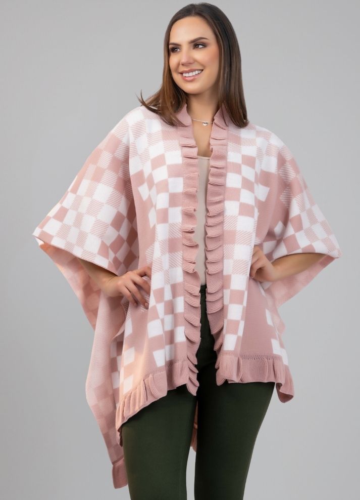 Ruana tipo capa con mangas, elaborada en hilo y decorada con un diseño ajedrezado