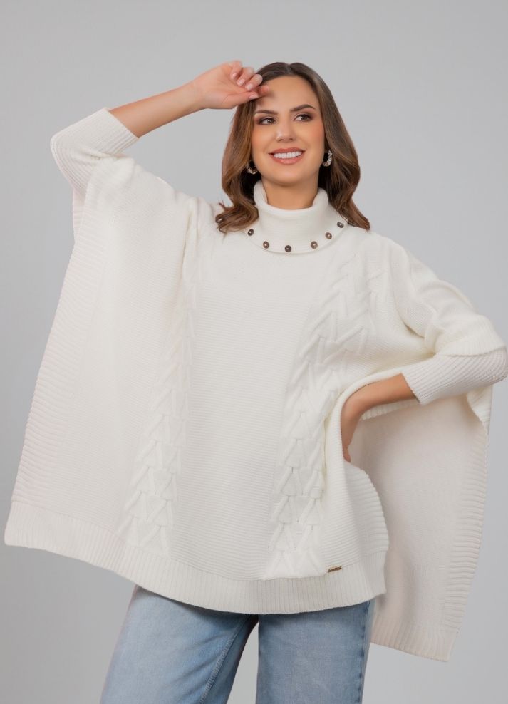 Ruana con mangas y cuello tortuga decorado, elaborada en tejido de hilo.