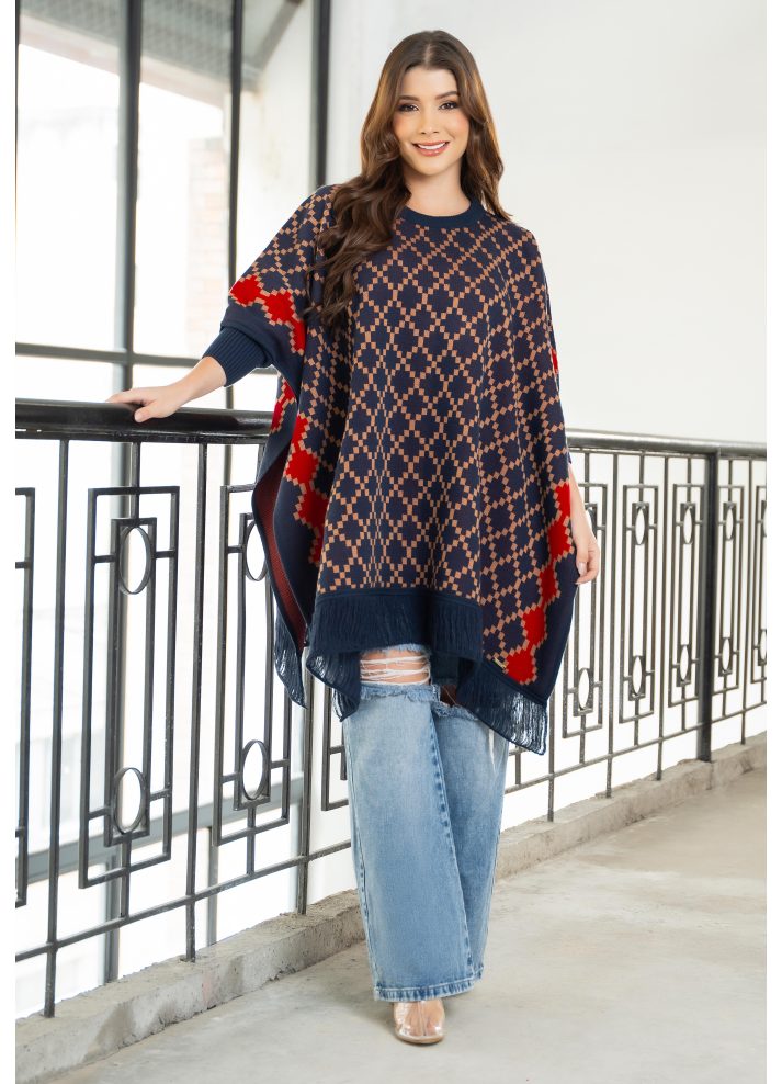 Ruana cuello tortuga con mangas tejida en hilo con rombos.