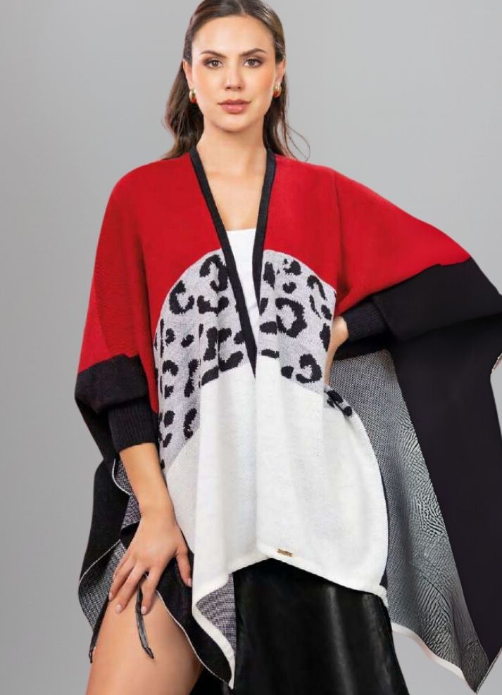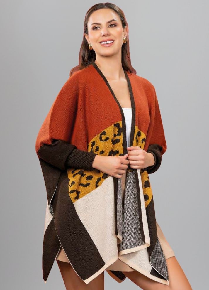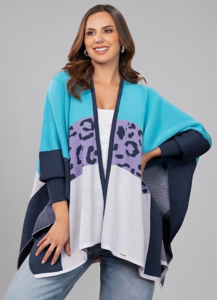 Ruana tipo capa con mangas, elaborada en hilo y decorada con un diseño de franjas coloridas combinadas con estampado animal, que aporta un aire sofisticado y moderno.