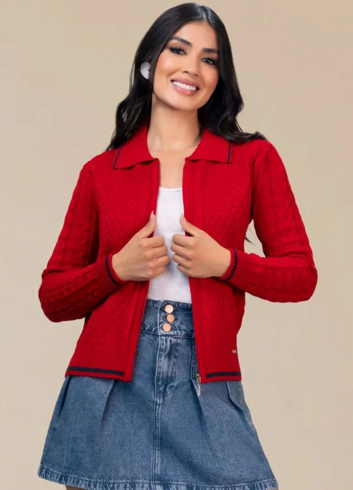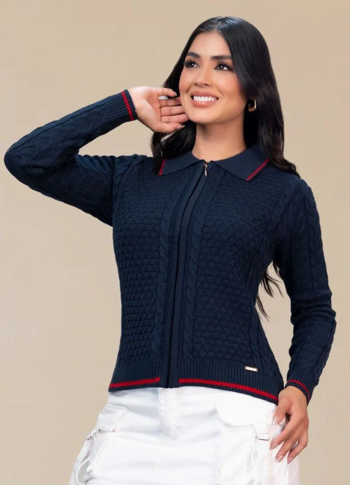 Cárdigan abierto con cierre, cuello tipo polo, tejido en hilo con un diseño temporal de rayas de contraste en mangas y parte interior del suéter.