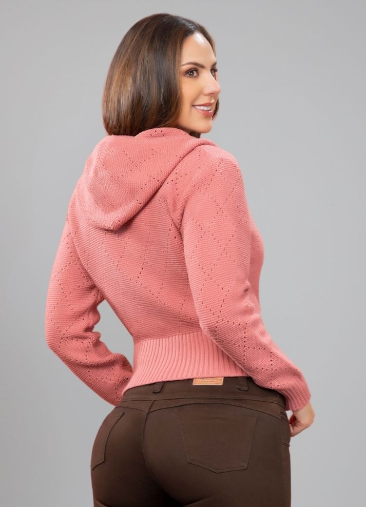 Cárdigan abierto con cierre y capota, tejido en hilo