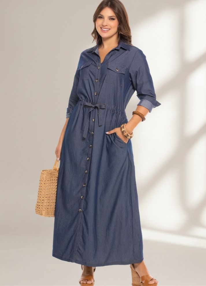 Vestido largo manga larga, con botones, bolsillos y un cinturón integrado en la cintura elaborado en tela chambray color azul. Perfecta para crear looks de día con presencia y distinción.